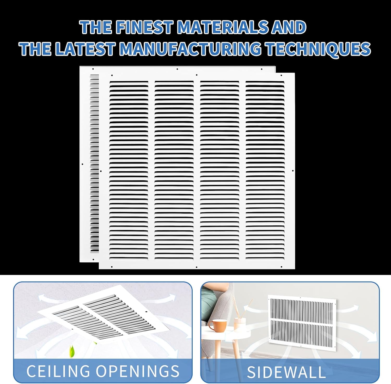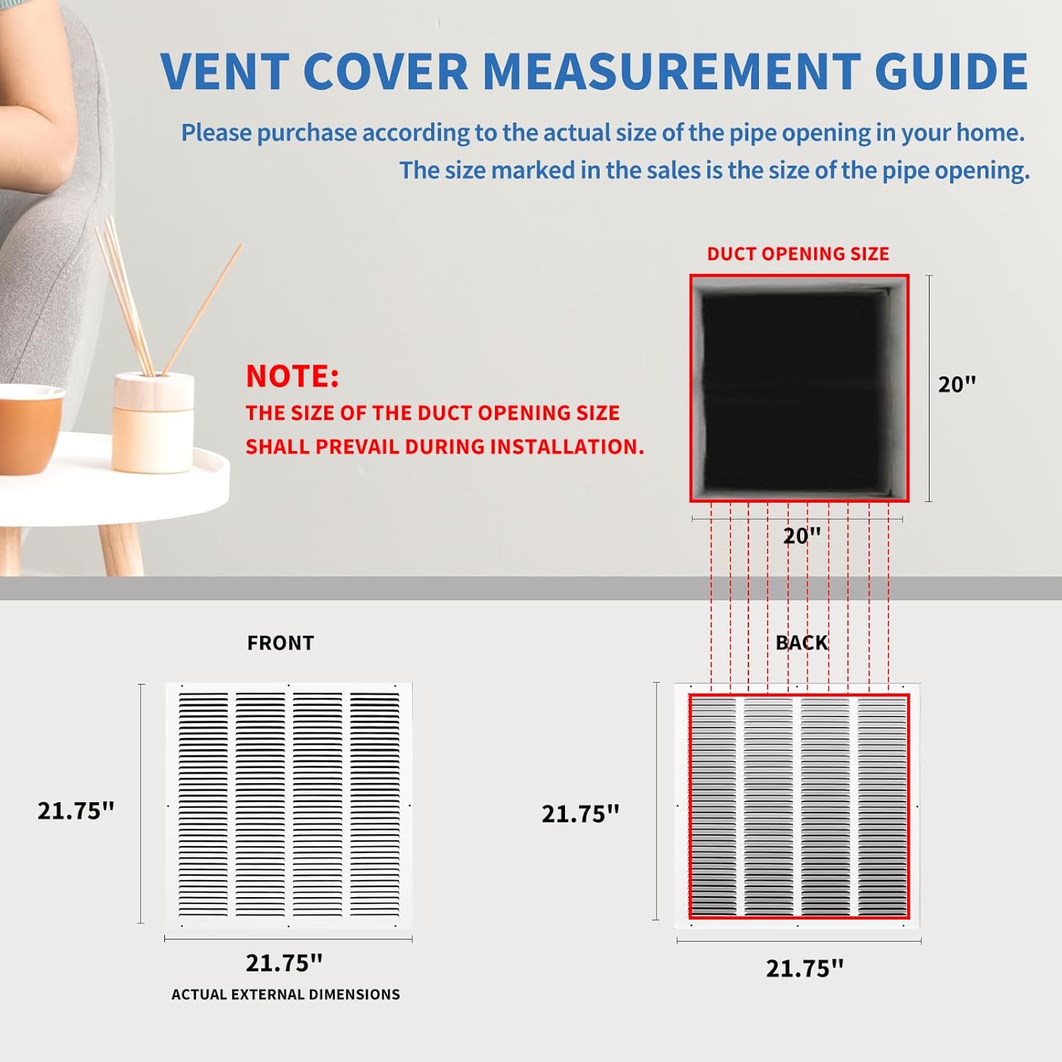 20x20 Vent Cover (Duct Opening Size), Outer Dimensions: 21.75"W x 21.75"H, Air Return Vent Cover, Flat Return Air Vent Cover, AC Intake Vent Cover 20x20, Cold Air Return Vent Cover, Wall Vent Cover, Return Vent Covers for Home Wall Features: ① This is a flat stamped steel return air grille. Please order by the duct opening measurement. (ONLY MEASURE THE DUCT OPENING, DO NOT MEASURE YOUR OLD GRILLE! ) How to Measure for Your Return Air Grille: Measure the Duct Opening (the hole on the wall/ceiling) by measuring the WIDTH first: 20", and then the HEIGHT: 20" (e.g. 20"W x 20"H), please order (20"W x 20"H, Duct Opening). This HVAC return air grille is the size you should order. ② Constructed from high-quality, solid stamped steel, this vent cover is built to endure. Scratch-resistant powder coat finish that withstands temperature fluctuations and daily use without warping, chipping, or fading. ③ Engineered with fixed, 40-degree angled fins and 1/2-inch spacing, this return air grille cover promotes maximum, unrestricted airflow while minimizing noise and vibration. Specification: - Design: Flat profile return air grille - Material: Heavy duty solid steel, durable powder coated - Duct Opening Size: 20"W x 20"H - Overall Grille Dimensions: 21.75"W x 21.75"H - Fin Design: 1/2" spaced fins set at a 40-degree angle - Primary Use: Side Wall and Ceiling (Return, Supply Applications) Package includes: 1 * 20x20 air return grille 1 * set of mounting screws - Flush-mount Installation: Step 1 - Remove your old grille. Remove the screws that secure the grille onto the wall/ceiling. If this is a ceiling application, prevent the grille from falling for your safety. Step 2 - Counter-sunk screw holes and no sharp edges ensure safe and easy handling. With included screws and concealed mounting holes, installation on any sidewall or ceiling is simple. Note: 1. Please allow a slight size variation of 0-0.4 inches due to manual measurement. 2. Due to lighting and monitor display differences, the actual product color may vary slightly from the images.