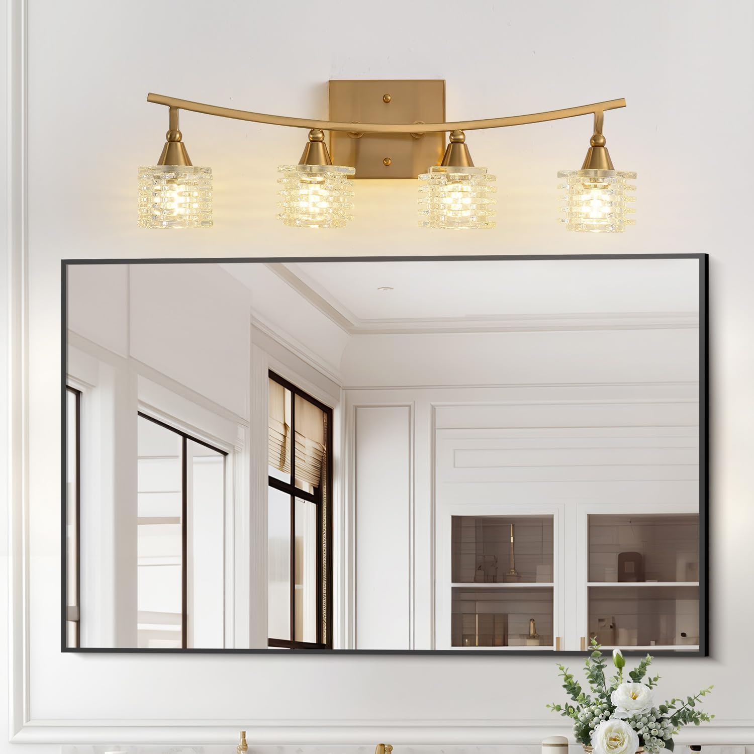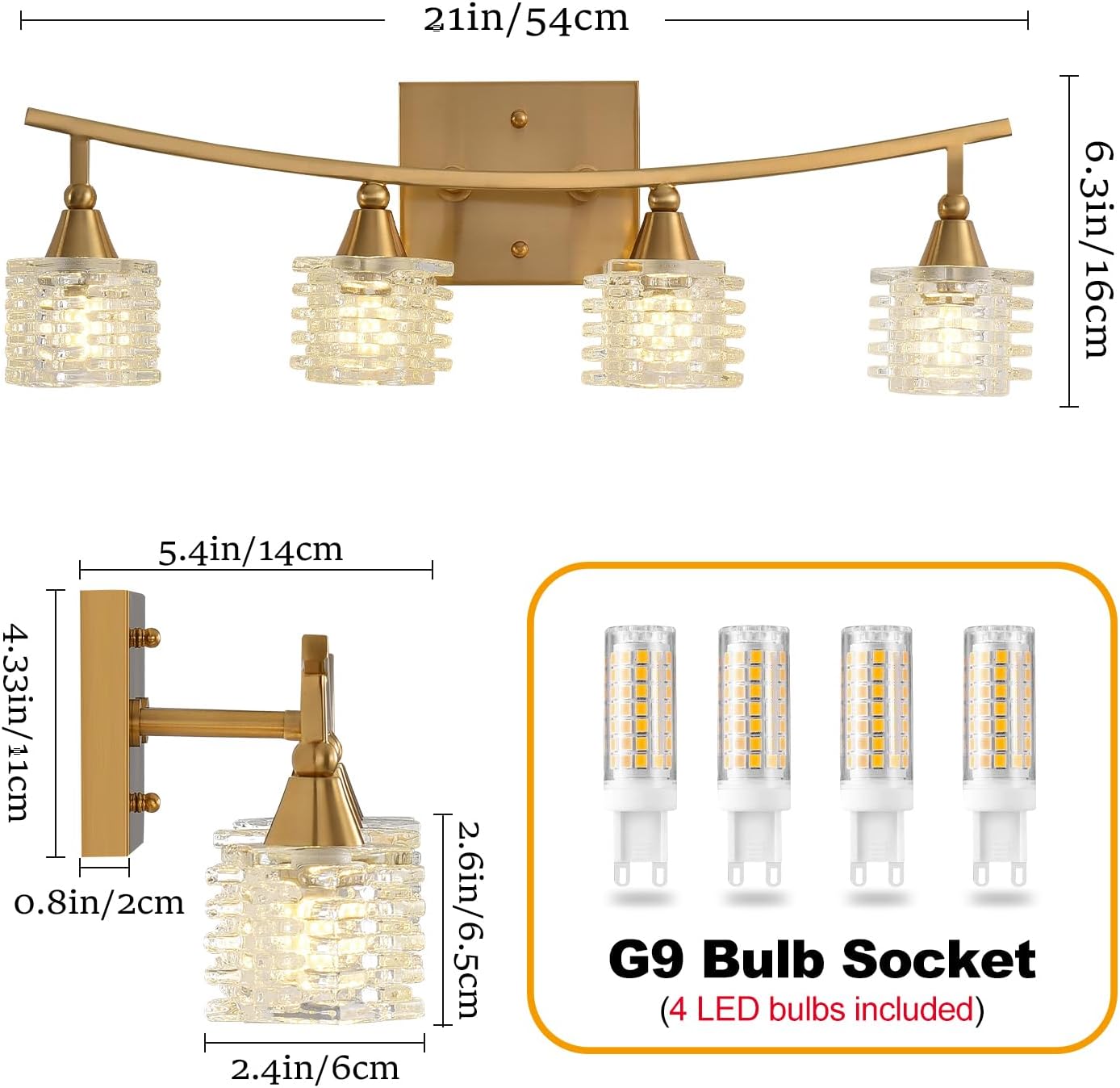 Brass Bathroom Light Fixtures, 4-Light Modern Vanity Light Over Mirrors, Wall Mount Sconces with Cube Glass Shades, G9 Sockets, Gold Color, LED Bulbs and Tools Included(Brass, Pack 1)