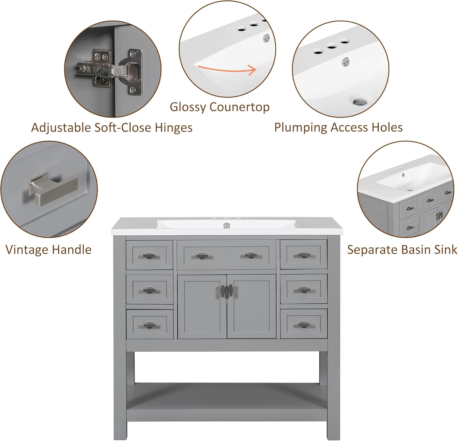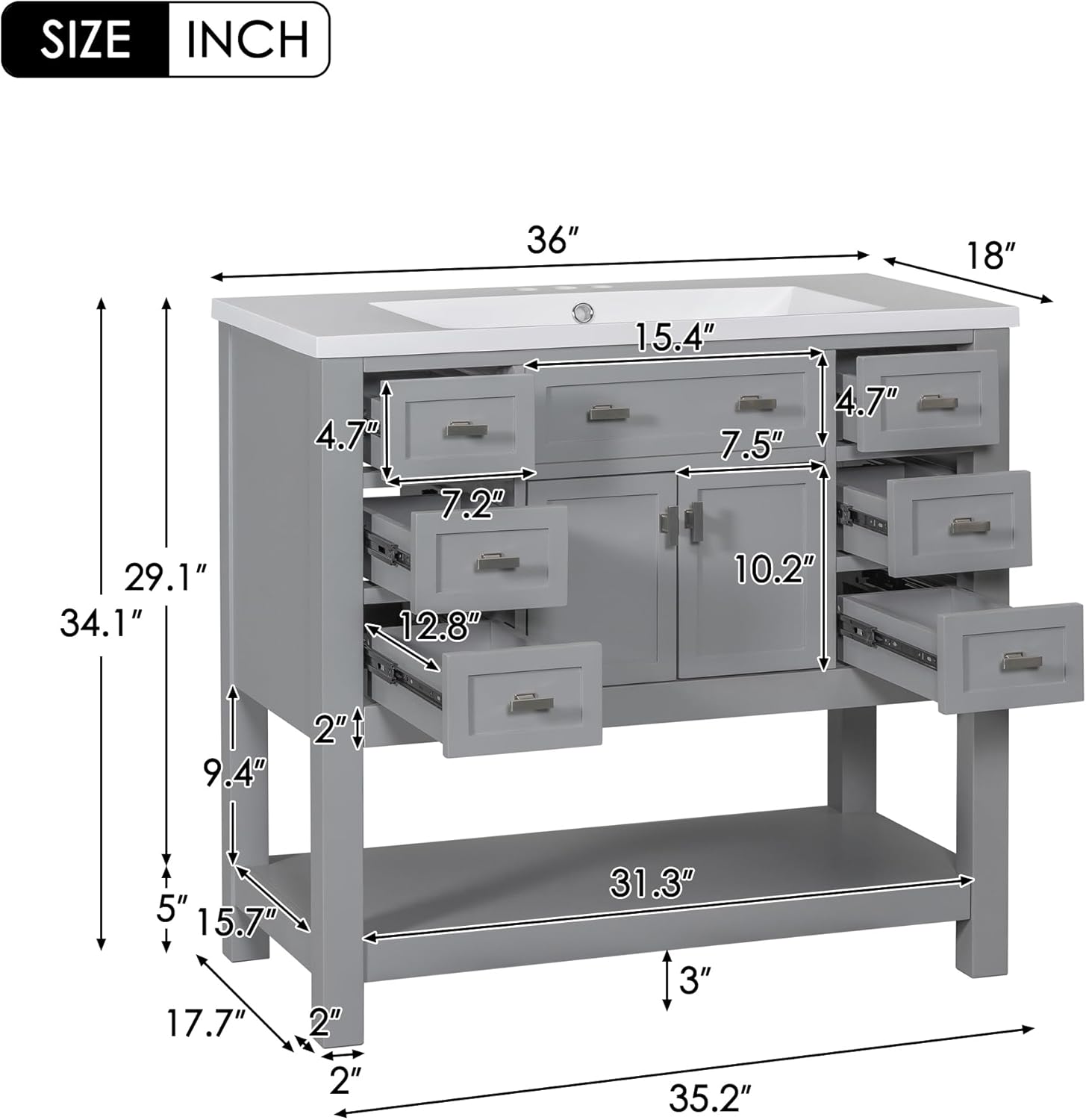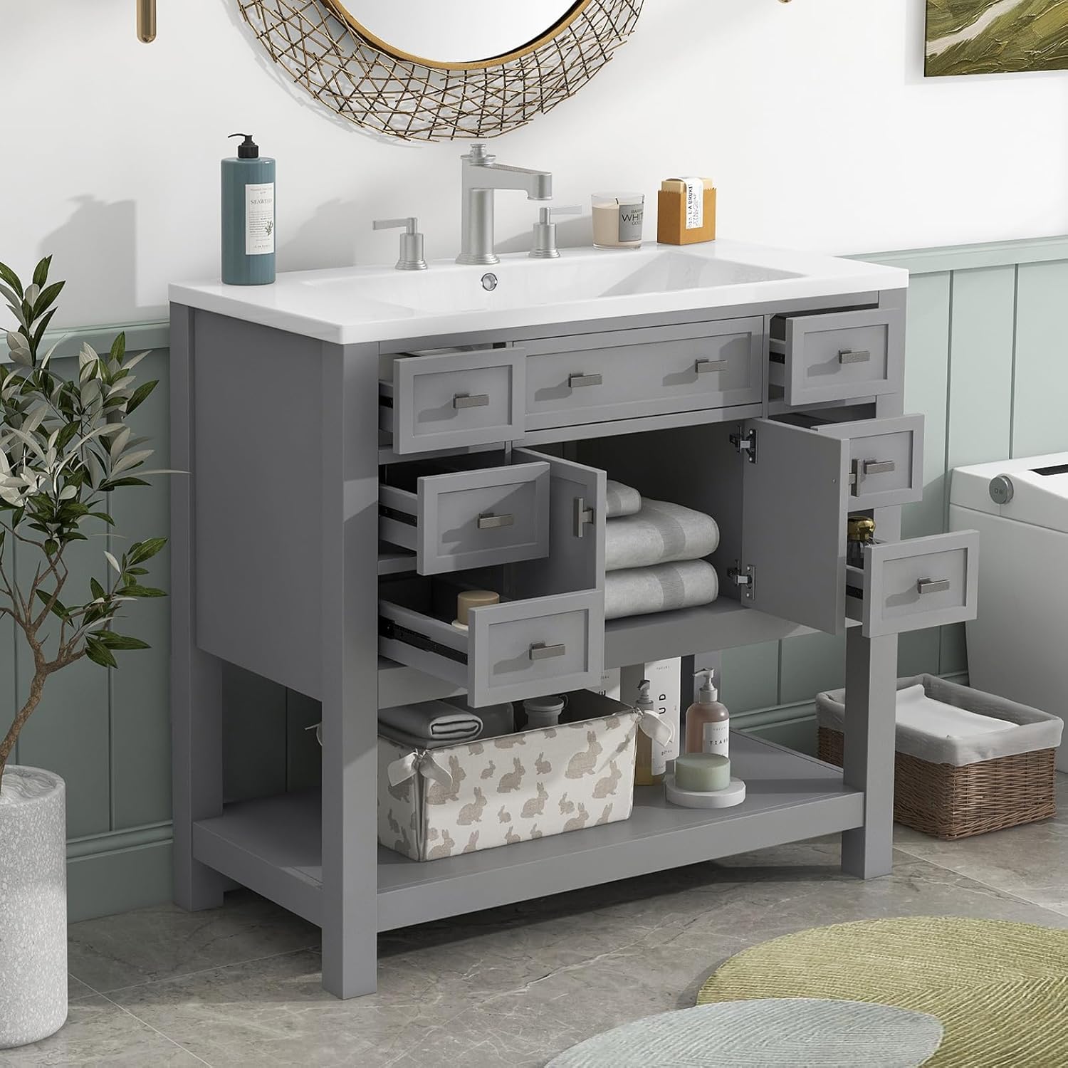 Transform your bathroom with this elegant 36-inch freestanding vanity cabinet, crafted from solid wood in a timeless white finish. The sophisticated design features a premium ceramic basin and generous storage options, including multiple drawers and a spacious cabinet with soft-closing doors for smooth, quiet operation. The thoughtfully organized layout includes a wide top drawer and three additional drawers on the left side, perfect for organizing toiletries and bathroom essentials. The right side cabinet provides ample space for larger items and cleaning supplies. The integrated ceramic sink basin offers both style and functionality, while the clean lines and classic hardware add a touch of refinement to any bathroom decor. This vanity combines practical storage solutions with beautiful craftsmanship, making it an ideal choice for both modern and traditional bathrooms. Assembly is straightforward, allowing you to quickly upgrade your bathroom's functionality and appearance.