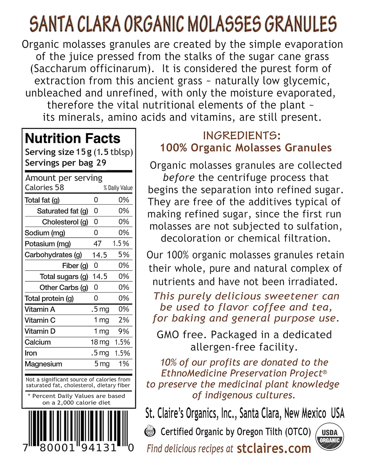 Santa Clara Organic molasses granules are collected before the centrifuge process that begins the separation into refined sugar. They are free of the additives typical of making refined sugar,since the first run molasses are not subjected to sulfation, decoloration or chemical filtration.