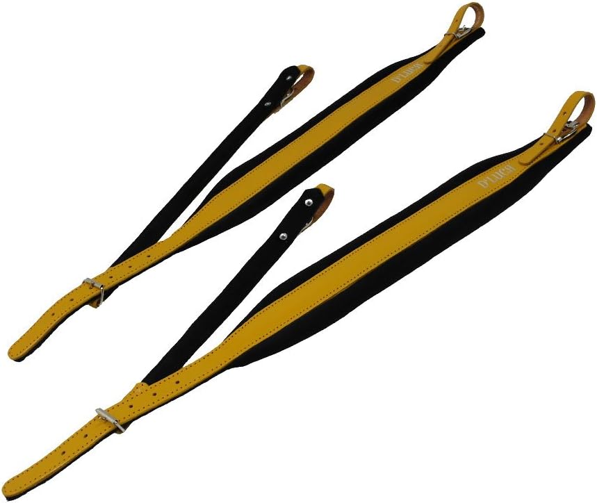 The D'Luca Pro DSG Series Genuine Leather Accordion Straps are designed to provide the accordion player the most comfortable playing experience. The 3 inch wide straps will give you stability and superior comfort while playing your accordion. Show your individuality with these two-tone accordion straps featuring ten different color combinations to choose from. The Pro DSG straps are made with the finest 100% Genuine Leather, Linen Velvet foam padding and professional stitching on each pair that fit and feel extremely comfortable. The wide strap design will allow you to play the accordion comfortably. Straps Specifications: Includes 2 Adjustable straps (pair), Thickness: 3/4 Inches, Wide: 3 inches, Adjustable Length: 41" (Shortest) to 46" (Longest), 100% Genuine Leather with velvet foam padding, Foam rubber inside, Professional stitching. This adjustable Straps fit from 12 bass accordions to 120 bass accordions. Made in Mexico.