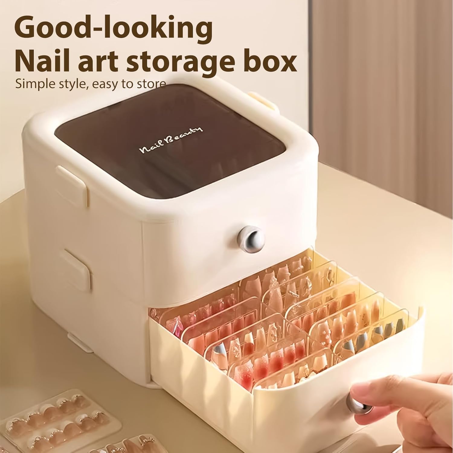 Crafted for nail artists, salon owners, and DIY enthusiasts who value both organization and presentation, our Double Layer Nail Tips Display Case delivers a professional-grade storage solution in a sleek, portable design. Featuring two transparent acrylic layers divided into individual compartments, this case keeps 80+ press‑on nails neatly separated by style, shape, and length—no more digging through cluttered bags or drawers. The sturdy, crystal‑clear glass lid protects your collection from dust, scratches, and moisture while offering a full view of your nail art inventory. Whether you’re a working nail technician carrying supplies to appointments, a salon displaying designs for clients, or a home user organizing a growing collection, this case is built to fit your life. Its compact, lightweight body tucks easily into a work bag or sits neatly on a vanity, yet offers ample space for everything from acrylic tips and false eyelashes to delicate jewelry and crafting beads. Every detail is designed for durability and daily use: the scratch‑resistant acrylic layers, secure locking lid, and smooth‑edged construction ensure your items stay safe and look polished. Ideal for gifting, professional use, or personal organization, this display case turns everyday storage into a stylish showcase.