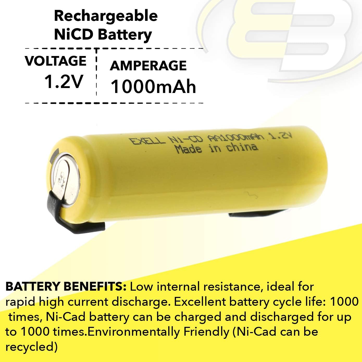 Exell AA 1.2V 1000mAh NiCD Rechargeable Battery with Tabs Exell AA 1.2V 1000mAh NiCD Rechargeable Battery with Tabs are excellent for building custom battery packs. If you are a novice or an old pro, these batteries will keep you powered up. These batteries can be recharged 500-1000 times giving you years of use. These high quality rechargeable Nickel Cadmium (Ni-Cd) batteries are exact Compatible Withs for standard battery in all the device. Provides ultra long use time per charge. Designed for enhanced performance for high drain applications such as digital cameras, CD players, portable audio devices, hand held games, 2-way radios, PDAs, and other portable high drain digital electronics. Can be recharged for up to 700 times, providing big saving by replacing hundreds of throw away batteries. Can be rapidly charged with any quick charger, smart chargers, plug in charger or universal chargers. Consumer Applications: Widely used in radio controlled devices, electric tools and toys, electric mopeds, meters, two radios, hybrid automobiles, electric razors, toothbrushes, cameras, camcorders, mobile phones, pagers, instruments/equipment, high power static applications (Telecoms, UPS and Smart grid), and numerous other applications. Exell AA 1.2V 1000mAh NiCD Rechargeable Battery with Tabs Specifications Voltage: 1.2V, Amperage: 1000mAh, Chemistry: Nickel Cadium (NiCD), Height: 1.89in, Diameter: 0.56in, Terminal Types: Tabs, NiCD Assembly Cell Battery Information Excellent quality and provide constant power electric current for your power hungry devices and some solar lights and solar applications., Low internal resistance, ideal for rapid high current discharge, Excellent battery cycle life: 1000 times, Ni-Cad battery can be charged and discharged for up to 1000 times, Environmentally Friendly (Ni-Cad can be recycled), If use once a day, Ni-Cad batteries can last up to 3 years.