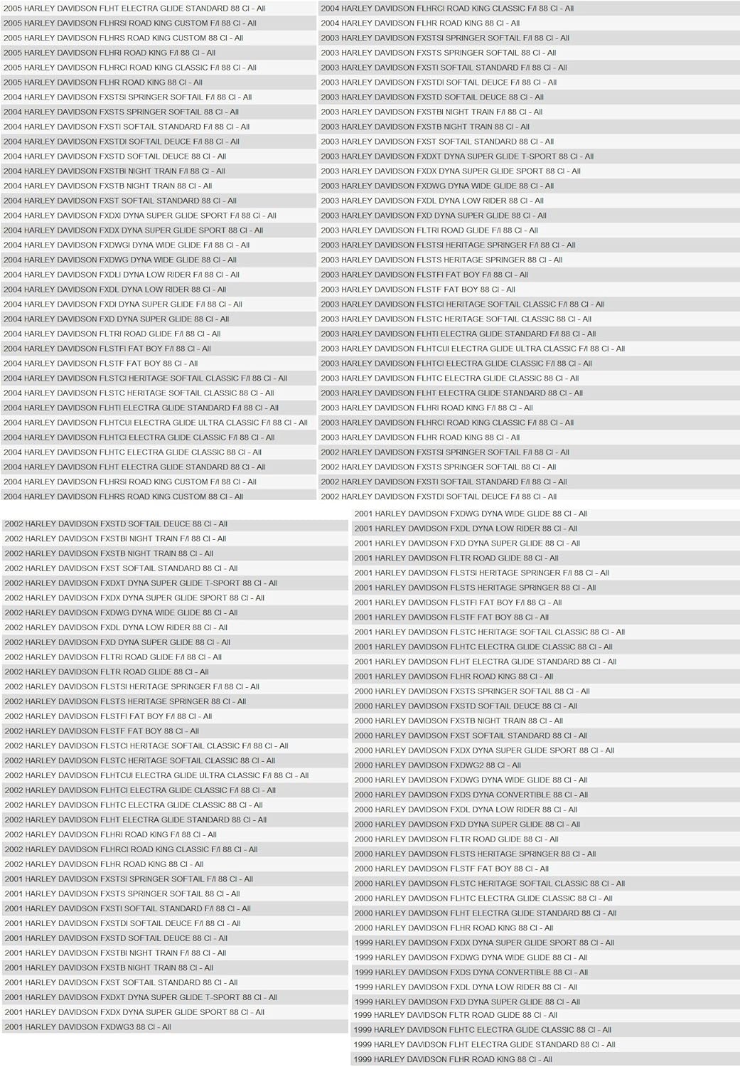 1. HD-1499 replacement air filters Compatible with : 1999-2007 FLHR Road King, 2007 FLHRC Road King Classic,2002-2006 FLHRCI Road King Classic,2002-2006 FLHRI Road King,2004-2007 FLHRS Road King Custom,2004-2006 FLHRSI Road King Custom 1999-2007 FLHT Electra Glide Standard,1999-2007 FLHTC Electra Glide Classic,2002-2007 FLHTCI Electra Glide Classic,2002-2006 FLHTCUI Electra Glide Ultra Classic, 2003-2006 FLHTI Electra Glide Standard 2007 FLHTP Electra Glide Police,2006-2007 FLHX Street Glide,2000-2015 FLSTC Heritage Softail Classic,2002-2006 FLSTCI Heritage Softail Classic,2000-2015 FLSTF Fat Boy,2010-2015 FLSTFB Softail Fat Boy Lo 2001-2006 FLSTFI Fat Boy,2006 FLSTI Heritage Softail,2005-2015 FLSTN Softail Deluxe,2005-2006 FLSTNI Softail Deluxe,2000-2003 FLSTS Heritage Springer,2008-2009 FLSTSB Softail Cross Bones 2005-2007 FLSTSC Softail Springer Classic,2005-2006 FLSTSCI Softail Springer Classic,2001-2003 FLSTSI Heritage Springer,1999-2002,2007 FLTR Road Glide,2002-2006 FLTRI Road Glide 2008-2009 FXCW Rocker,2008-2011 FXCWC Rocker C, 1999-2005,2007 FXD Dyna Super Glide,2007 FXDB Street Bob,2006 FXDBI Street Bob,2007 FXDC Super Glide Custom,2005-2006 FXDCI Dyna Super Glide Custom 2009 FXDFSE CVO Fat Bob,2004-2006 FXDI Dyna Super Glide,1999-2005,2007 FXDL Dyna Low Rider,2004-2006 FXDLI Dyna Low Rider,1999-2000 FXDS Dyna Convertible,1999-2007 FXDWG Dyna Wide Glide 2004-2006 FXDWGI Dyna Wide Glide,1999-2004 FXDX Dyna Super Glide Sport,1999-2004 FXDX Dyna Super Glide Sport,1999-2004 FXDX Dyna Super Glide Sport,2004-2005 FXDXI Dyna Super Glide Sport 2001-2003 FXDXT Dyna Super Glide T-Sport,2014-2015 FXSB Breakout,2000-2007 FXST Softail Standard,2000-2009 FXSTB Night Train,2001-2006 FXSTBI Night Train,2007-2010 FXSTC Softail Custom 2000-2007 FXSTD Softail Deuce,2001-2006 FXSTDI Softail Deuce,2001-2006 FXSTI Softail Standard,2000-2006 FXSTS Springer Softail,2001-2006 FXSTSI Springer Softail