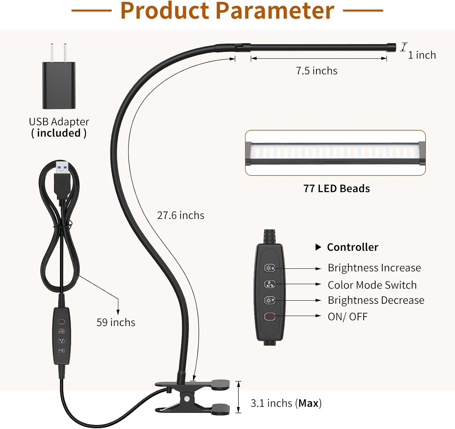 | Additional Features | 2 year-warranty, 27.6 inches gooseneck, 59 inches Corded, Dimmer (3 Color Modes & 10 Brightness Levels) |