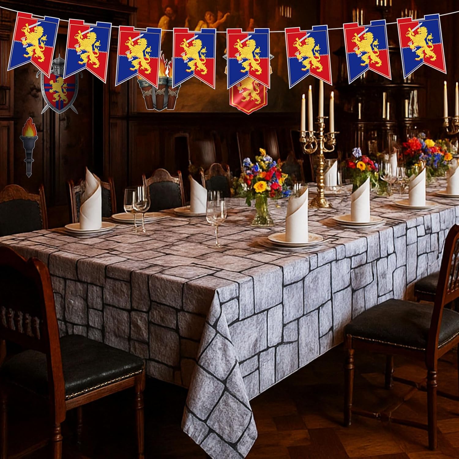 Features: Versatile Background Application The stone wall backdrop creates an instant medieval atmosphere as a photo wall or room divider. The flexible plastic material easily mounts to various surfaces using tape or pins without damaging walls Multi-Use Thematic Elements Beyond wall decor, the included cards serve as table scatter, invitation inserts, or party activity props. The coordinated elements work together to create a cohesive medieval experience Specifications: Color: Classic Color Size: Medieval banner: 6.3 x 4.3 inches Stone wall background cloth: 4.4 x 80 ft Package includes: 1 X medieval banner 1 X stone wall background cloth 16 x Medieval cards Notes: Manual measurement, please allow slight errors on size. The color may exist a slight difference due to different screen displays
