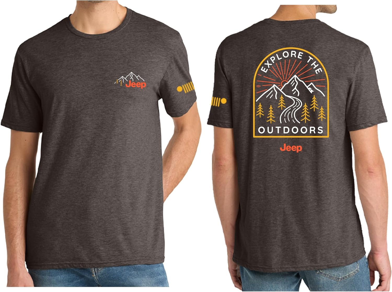 Bring adventure everywhere you go with the Men’s Jeep “Explore The Outdoors” T-Shirt – a supersoft 100% cotton graphic tee that celebrates the freedom of the open trail. This officially licensed design features a bold mountain and forest print with “Explore The Outdoors” and the Jeep logo across the back, paired with a smaller Jeep chest print and a Jeep grille logo on the sleeve for added authenticity. Made from lightweight, premium cotton in a rich Heather Brown, this shirt offers everyday comfort with a classic crewneck and side-seamed construction to maintain its fit. Perfect for hiking, weekend drives, or casual wear, it’s the ultimate tee for anyone who lives the Jeep lifestyle and loves exploring the outdoors. Jeep, the Jeep grille, and related logos are trademarks of FCA US LLC and used under license by Detroit Shirt Company. 2025 FCA US LLC.