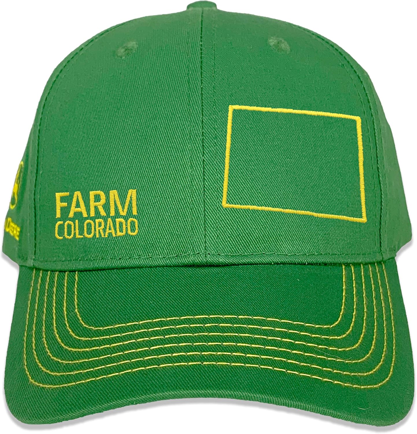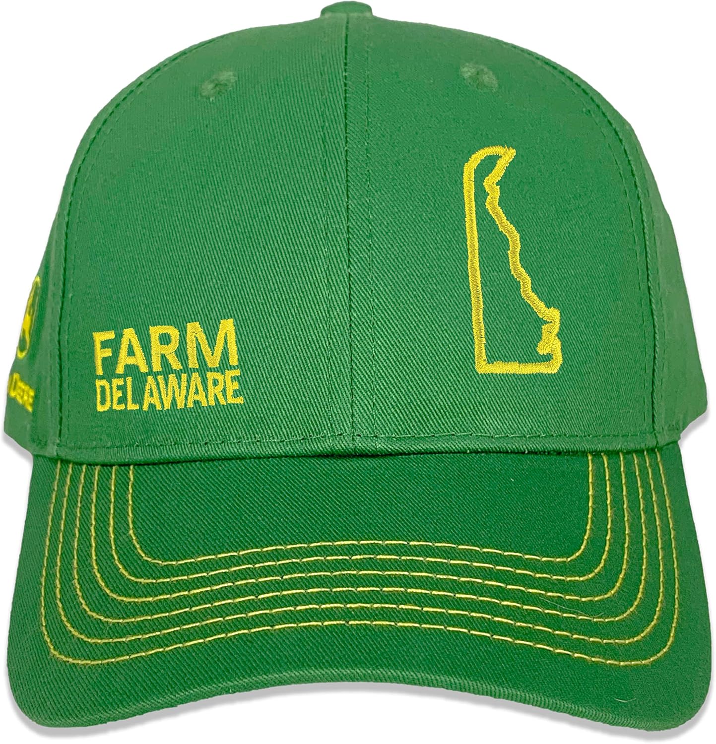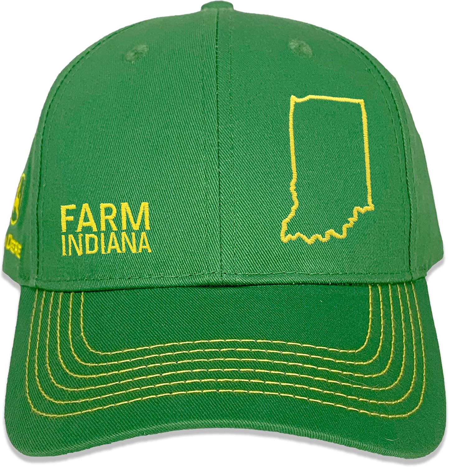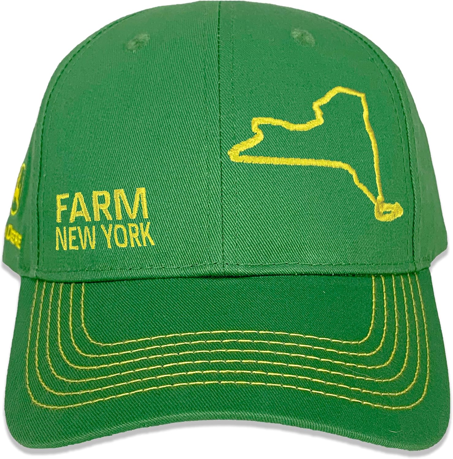 Officially licensed John Deere Full twill style Farm baseball cap in our traditional John Deere tractor colors, green and yellow. Green with yellow contrast stitching on the bill. Features FARM, your state name, and state outline embroidered on the front of the hat. Keep cool all summer long in this classic John Deere mesh twill cap. The adjustable back strap makes resizing a snap! We carry all 50 states. Embroidered right here in the USA. Makes a great gift for any occasion; Perfect for holidays, birthdays, and more.