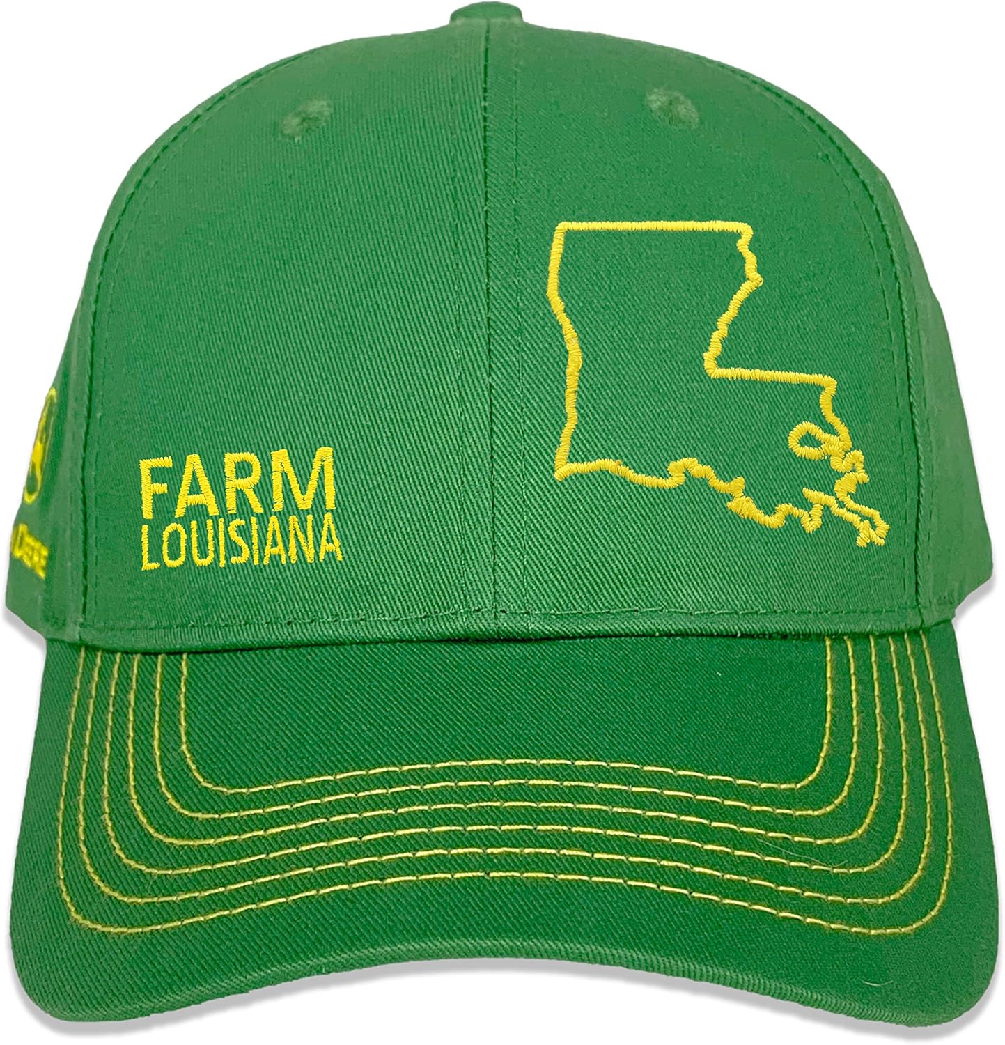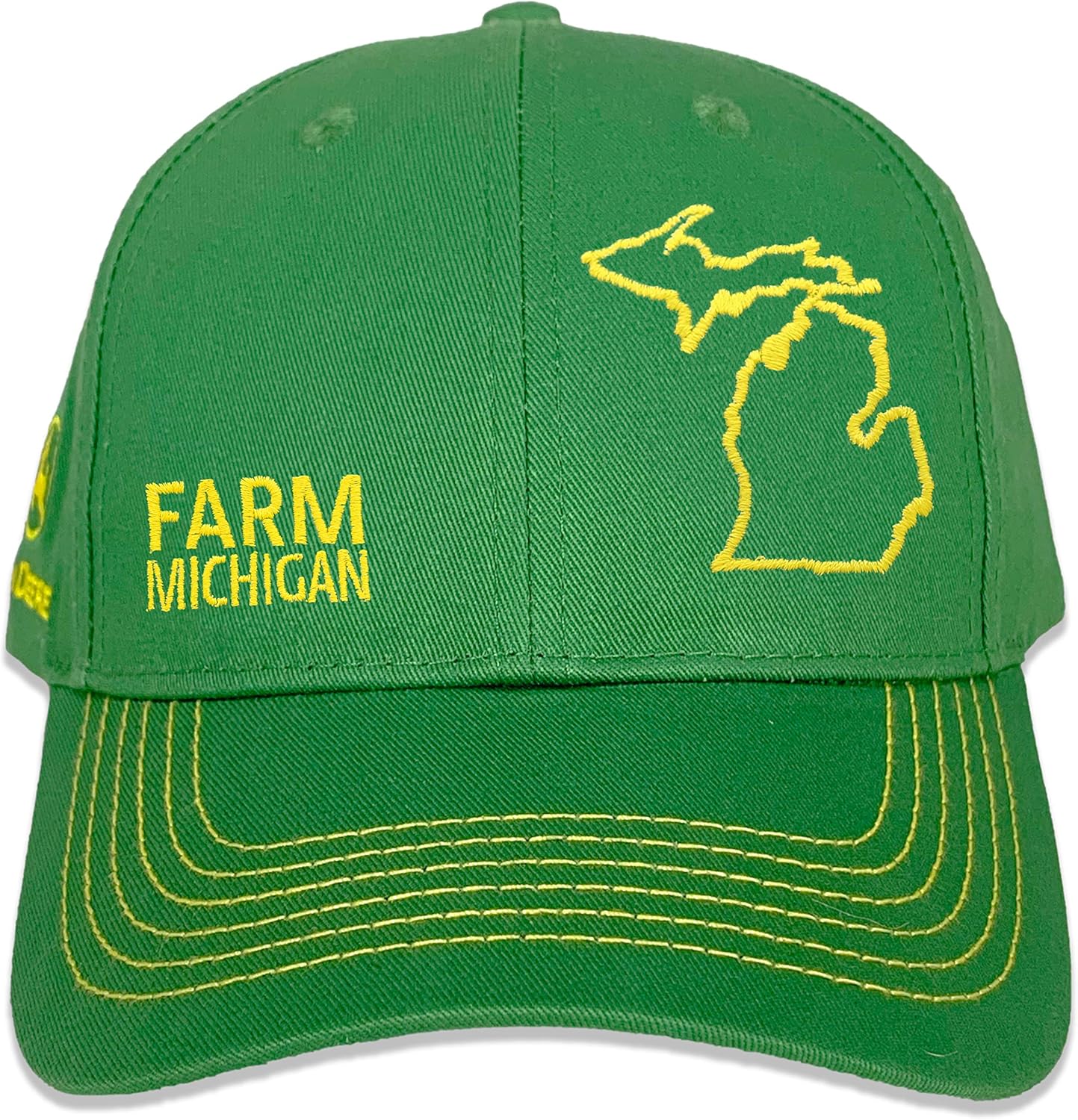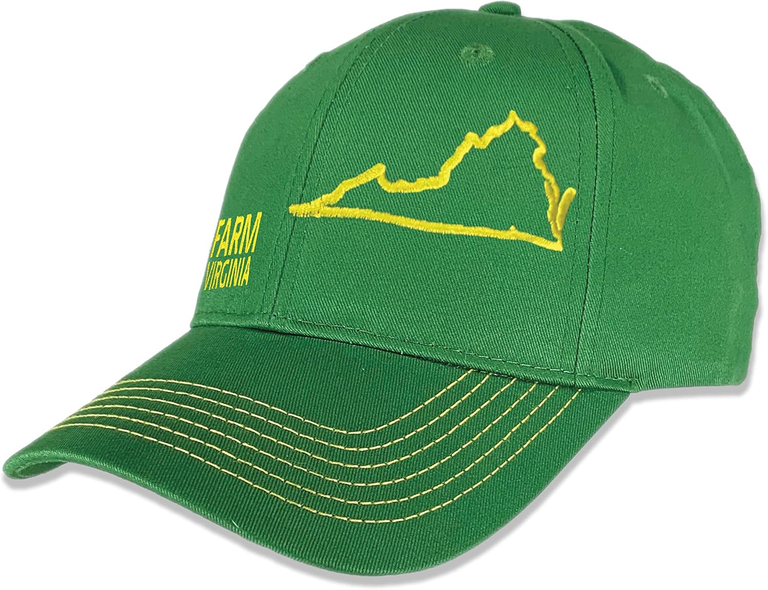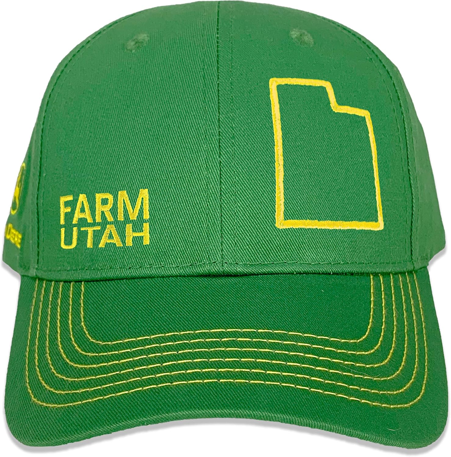 Officially licensed John Deere Full twill style Farm baseball cap in our traditional John Deere tractor colors, green and yellow. Green with yellow contrast stitching on the bill. Features FARM, your state name, and state outline embroidered on the front of the hat. Keep cool all summer long in this classic John Deere mesh twill cap. The adjustable back strap makes resizing a snap! We carry all 50 states. Embroidered right here in the USA. Makes a great gift for any occasion; Perfect for holidays, birthdays, and more.