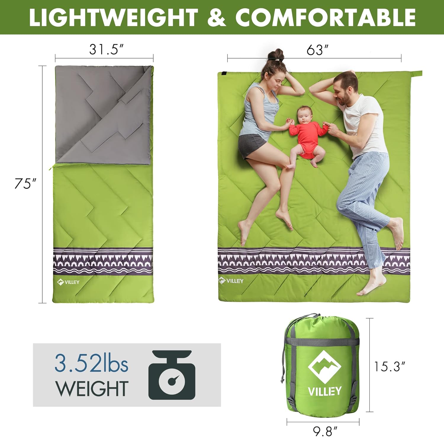 VILLEY Camping Sleeping Bag, Lightweight Backpacking Sleeping Bag with Compression Sack for Adults & Kids, Outdoor Camping Hiking Equipment for 3 Season Warm & Cool Weather - Summer, Spring, Fall