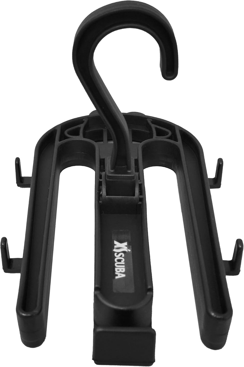 Meet our Foldable Drysuit Hanger — the ultimate solution for organized gear management. Hang your drysuit upside-down by the feet to ensure excellent drainage. With a swivel attachment hook, tough X-beam design, Yoke and DIN regulator connections, this hanger adapts to your needs. Fold it flat for travel and utilize the hooks on the sides and front for convenient gear storage.